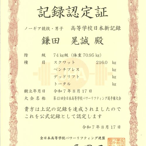 2025-08-17高等学校日本新記録の認定証をいただきました。8月17日に行われました第43回全日本高等学校パワーリフティング選手権大会にて、本校生徒3年の鎌田晃誠君がスクワット競技にて74キロ級の216㎏を記録し、高等学校日本新記録を更...