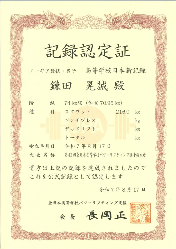 第43回全日本高等学校パワーリフティング選手権大会 部活動 2025.10.02 2025-08-17高等学校日本新記録の認定証をいただきました。8月17日に行われました第43回全日本高等学校パワーリフティング選手権大会にて、本校生徒3年の鎌田晃誠君がスクワット競技にて74キロ級の216㎏を記録し、高等学校日本新記録を更新しました。そのことは以前のホームページにもお伝えしましたが、この度、正式に記録認定証をいただきました。これまでの彼の努力の賜物だと思います。本部活の目標でもある今後の励みになってくれればと思います。