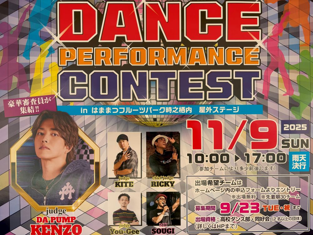 ダンス部がダンスパフォーマンスコンテストに出演 学校長の絶好調ブログ 2025.10.09 本校ダンス部が、11月9日(日)に、はままつフルーツパークで開催される「第11回 浜松いわたしんきんダンスパフォーマンスコンテスト in はままつフルーツパーク」に出演します。 DA PUMPのKENZOさんなど著名なダンサーが審査員を務めます。 ここ最近、ダンス部は積極的に外部の大会に出場し、武者修行をしています。文化祭のパフォーマンスではその成果が如実に現れていました。 みんなで応援していきましょう!