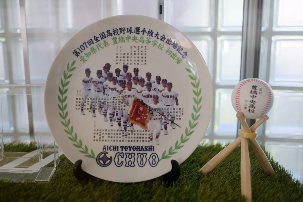 甲子園出場記念皿 学校長の絶好調ブログ 2025.10.20 本校硬式野球部はこの夏に初の甲子園出場を果たし、愛知県代表として戦ってきました。 甲子園出場を記念し、野球部が記念皿を作成し、1枚を学校に寄贈してくれました。甲子園出場メンバーが開会式で元気に行進していた姿があしらわれています。 1号館2階ホールに展示してあります。来校の際に是非ご覧ください。