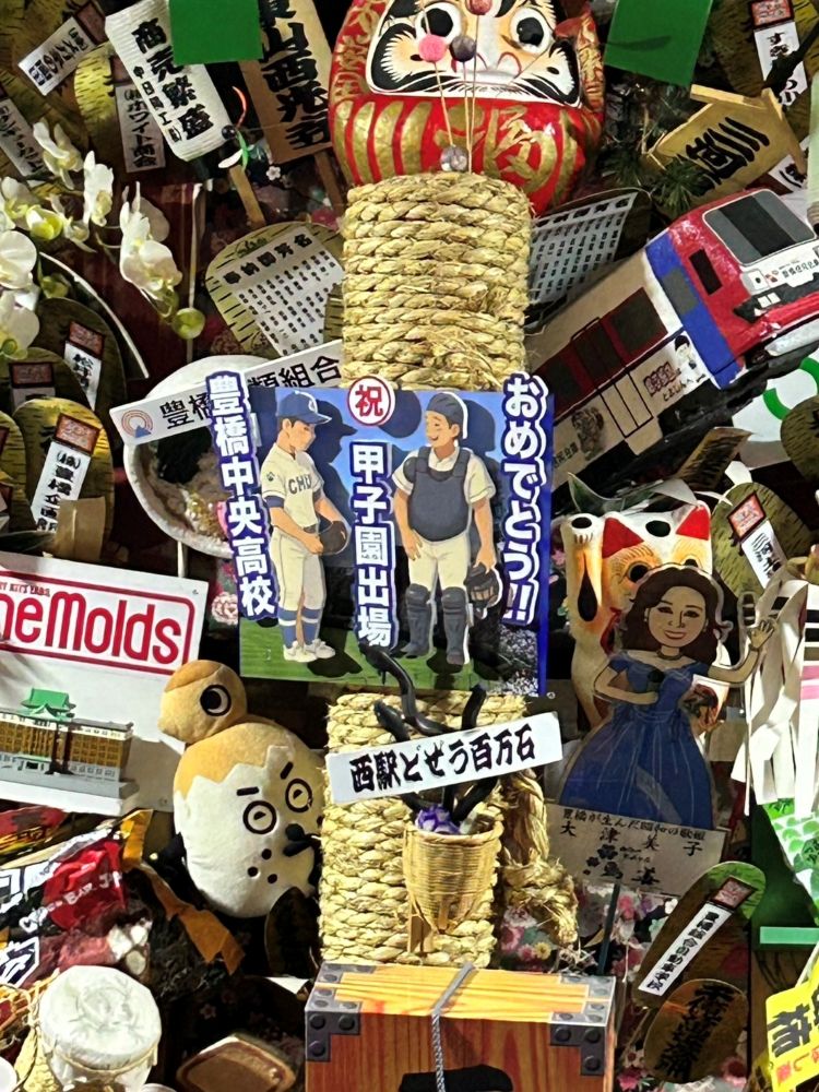 三河酉の市に豊橋中央高バッテリー大熊手 学校長の絶好調ブログ 2025.12.09 12月5日(金)と6日(土)に、豊橋市の西光寺にて「三河酉の市」が開催されました。 毎年、豊橋名物を施した大熊手が奉納されます。今年、豊橋市民にとってビッグニュースのひとつは、豊橋中央高校硬式野球部の甲子園出場でした。それを反映し、髙橋大喜地投手と松井蓮太朗捕手のバッテリーをイメージした飾り付けを加えていただきました。 12月7日付の東愛知新聞に取り上げていただきました。