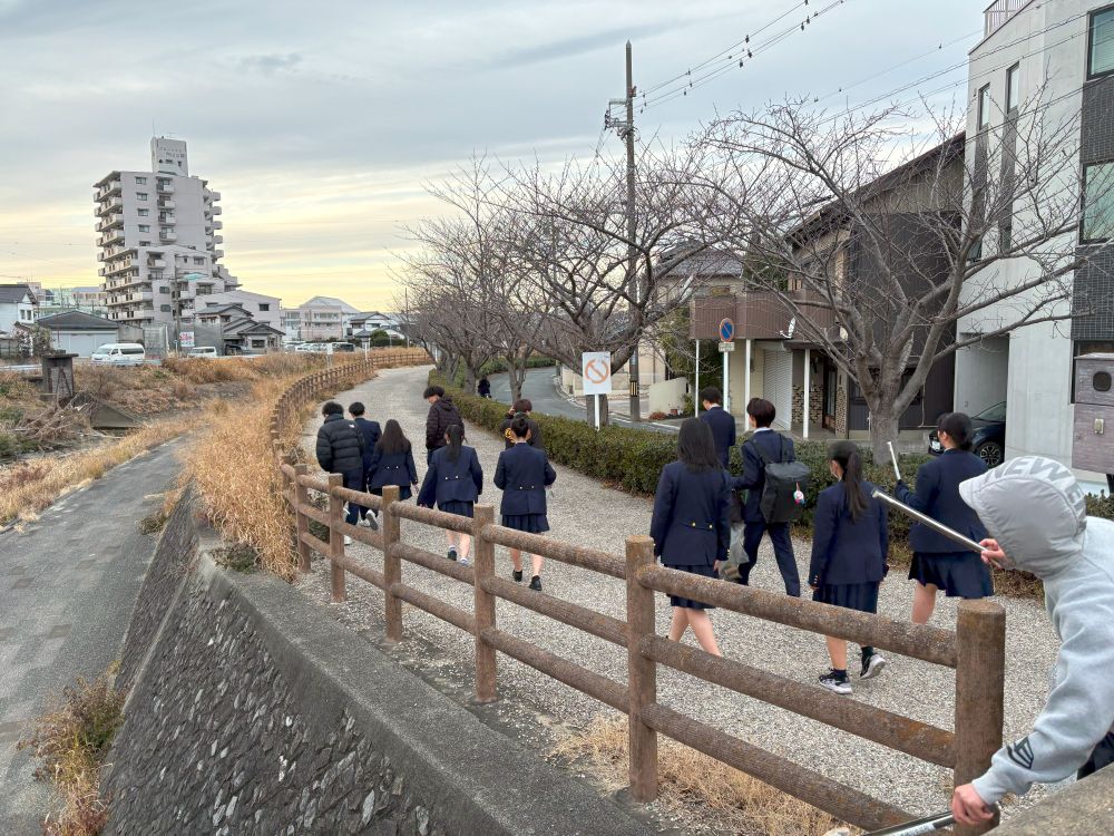 リアカーボランティア(2月) 学校長の絶好調ブログ 2026.01.23 1月20日(火)、ユネスコ委員と有志生徒がリアカーボランティアを実施しました。 3年生は学年末試験中ですので、1・2学年が主体となりました。3年生の卒業が近づくと、だんだんと1・2年生だけで動くことが多くなります。 大寒波襲来で風も強く、本当に寒い日でしたが、楽しく学校周辺の美化活動を行いました。