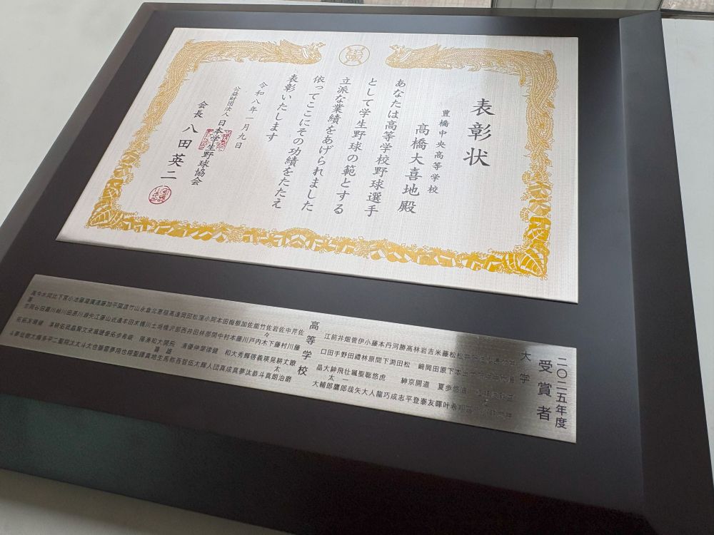 以前、髙橋大喜地選手が日本学生野球協会から表彰を受けたことをお伝えしました(参照)。髙橋選手は本校硬式野球部のエース投手で、今年度夏の甲子園初出場の原動力となりました。