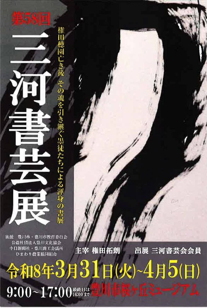 三河書芸展 学校長の絶好調ブログ 2026.04.01 3月31日(火)から4月5日(日)まで、豊川市桜ヶ丘ミュージアムにて、第58回三河書芸展が開催中です。 本校で国語科・芸術科の教員を務める書道家、権田拓朗先生や遠藤茂樹先生の作品が展示されている他、本校芸術部(書道)や令和7年度未来探究伝統工芸フィールド生徒の作品も展示されています。 お花見がてら是非お立ち寄りください!