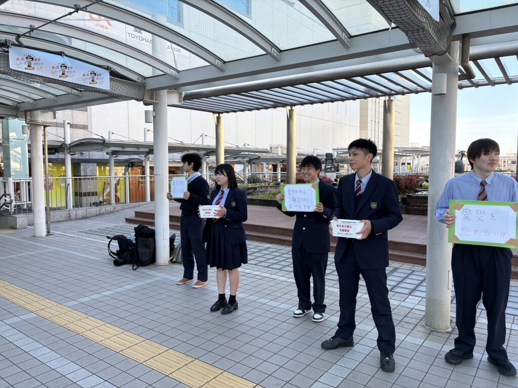 本校が「二次避難所」であることを活かし、豊橋市防災危機管理課から防災備品の使用法や避難所設営のノウハウを学ぶ。また、豊橋市総合防災訓練や豊橋市内各自治会での防災訓練、防災危機管理課主催イベントなどで「高校生防災リーダー」として協働活動する。